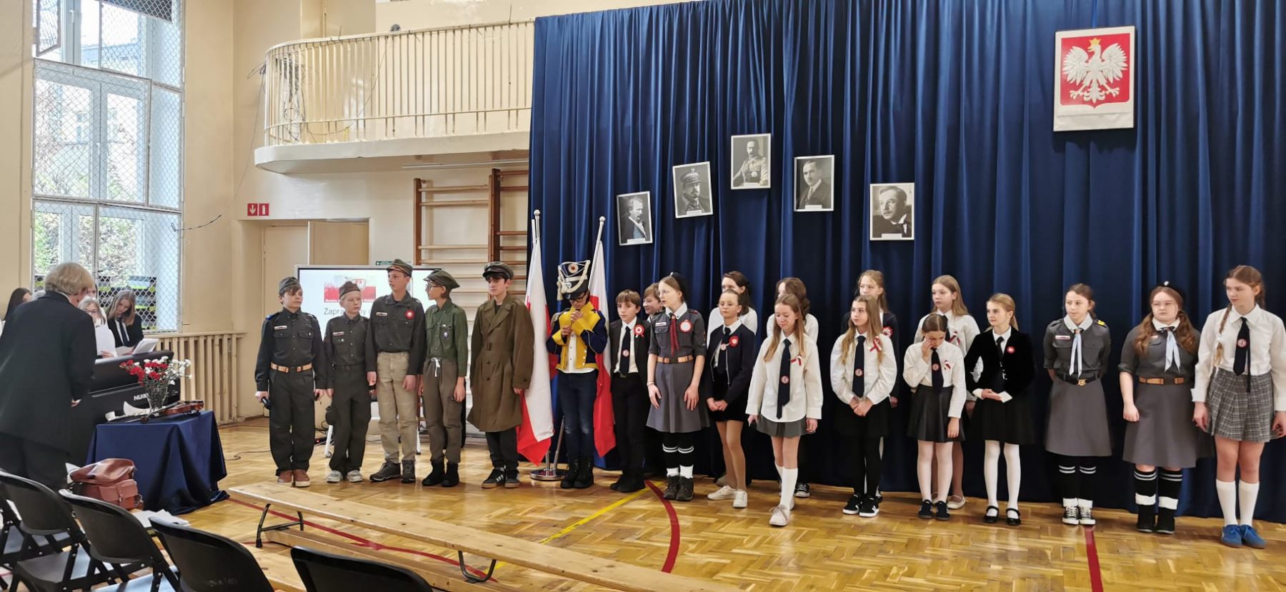 Wysłuchaliśmy krótkiej, ale poruszającej lekcji historii, przetykanej tekstami poetyckimi. Były to wiersze recytowane przez Lidię z nawracającym stwierdzeniem; „ Ojczyzna moja tam, tam jest…” oraz piosenka Norwida z charakterystycznym refrenem „Tęskno mi, Panie”. Recytację tekstów ozdobiły zagrane przez Juliana, Alisę i Gabrysię melodie do znanych piosenek żołnierskich oraz walc Chopina w wykonaniu Jaśka.