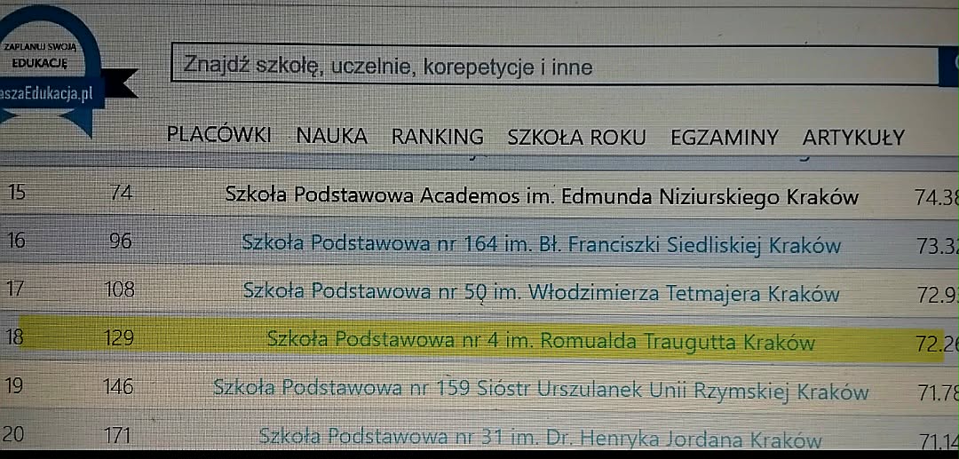 miejscu w najnowszym rankingu szkół podstawowych w Krakowie oraz w ścisłej czołówce wśród publicznych samorządowych szkół krakowskich.